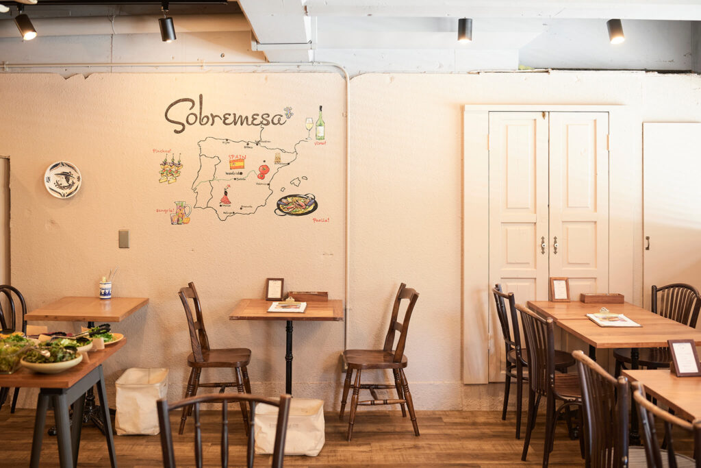 山科駅そばにあるスペイン料理店「ソブレメサ」。店名はスペイン語で“食事の後の団らん”の意味。「ゆったりとくつろいで食事を楽しむスペインバルの雰囲気を知ってほしいと店名にしました」。そう語る店主の片山織恵さんは、フランス料理やスペイン料理のシェフとして15年ほど経験を積み、2021年に同店をオープンしました。