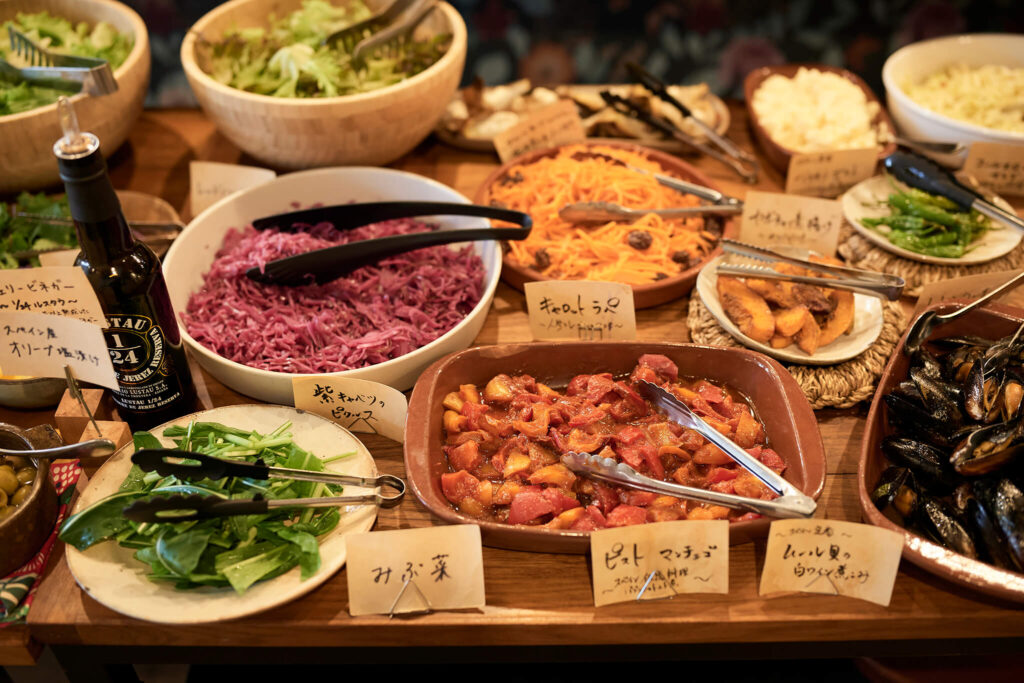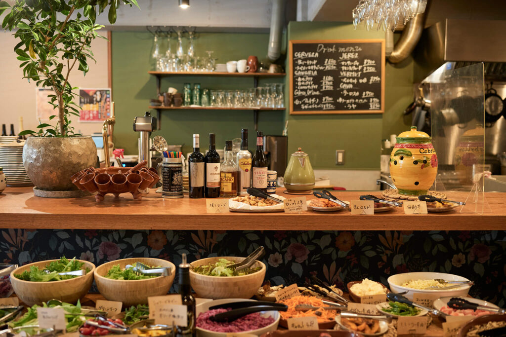 大きな扉を開けて目に入るのは、壁に描かれたスペインの地図やディスプレイの絵皿。片山さんがスペインで感じとった、気取らずに食事を楽しむスペインの空気感が店内に漂います。カウンターに目を移せば、色とりどりの野菜がズラリ。ランチ限定のサラダュッフェには、30種類もの野菜を使用しているそう。この日は、赤ネギのスライスやビーツ、ズッキーニのピクルスなど、カラフルな野菜料理が並んでいました。