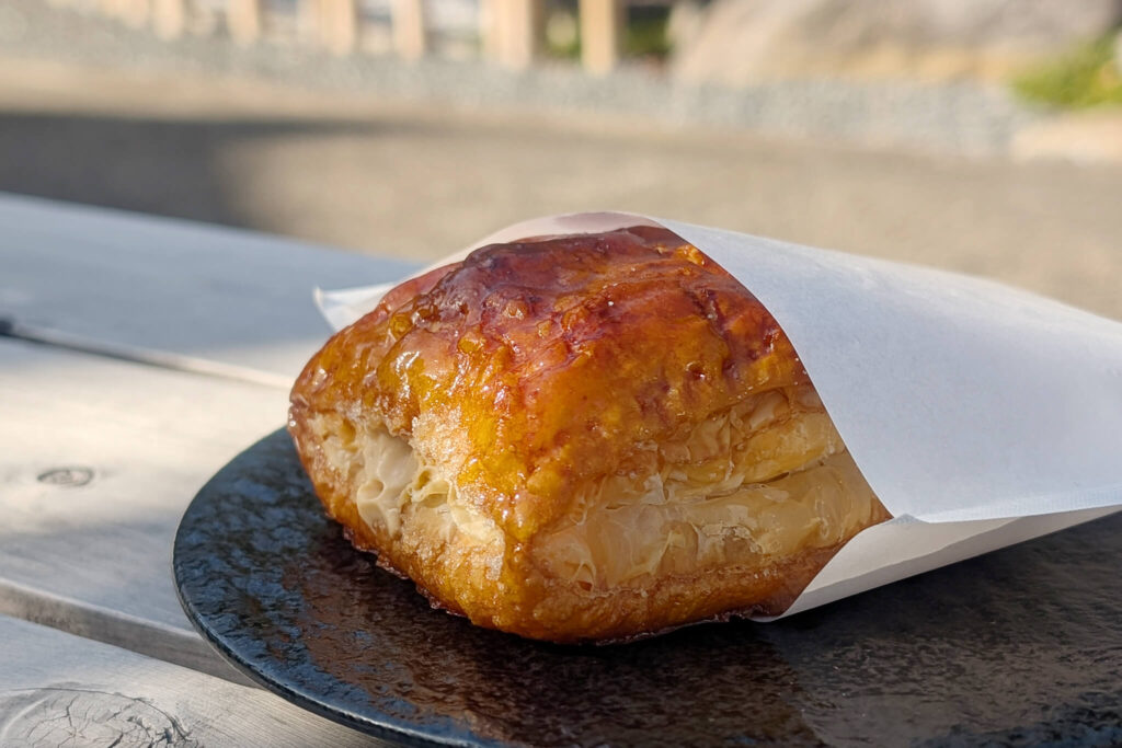 拝観でパワーをもらったあとは、公開日に合わせてオープンしているテイクアウトのお店「寺菓房せむい」へ。米粉を使ったシフォンケーキや、サクサクのパイ生地が特徴のカスタードパイといった、体にやさしい素材でつくられたこだわりのお菓子が並びます。